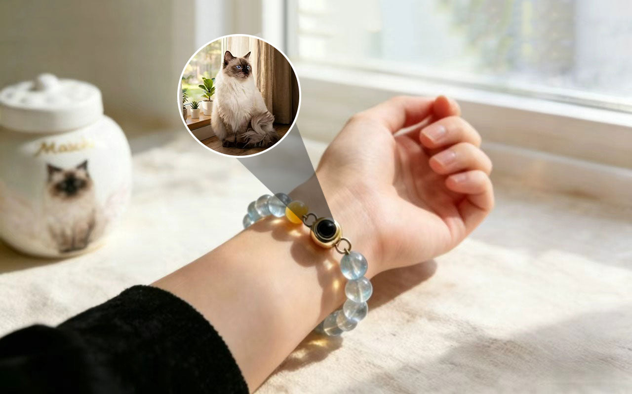 Some want something they can carry — a quiet, wearable way to feel close again. Others want a place. Something still. Something that feels like peace. At Aurmory, we create both. From projection stone bracelets that reveal your pet's face in light, to handcrafted ceramic urns that give them a lasting place of rest.